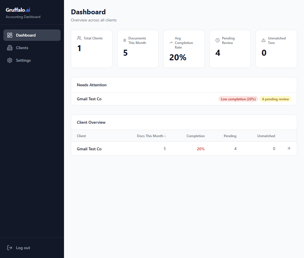 Connect your client's Gmail. Attachments auto-extracted.